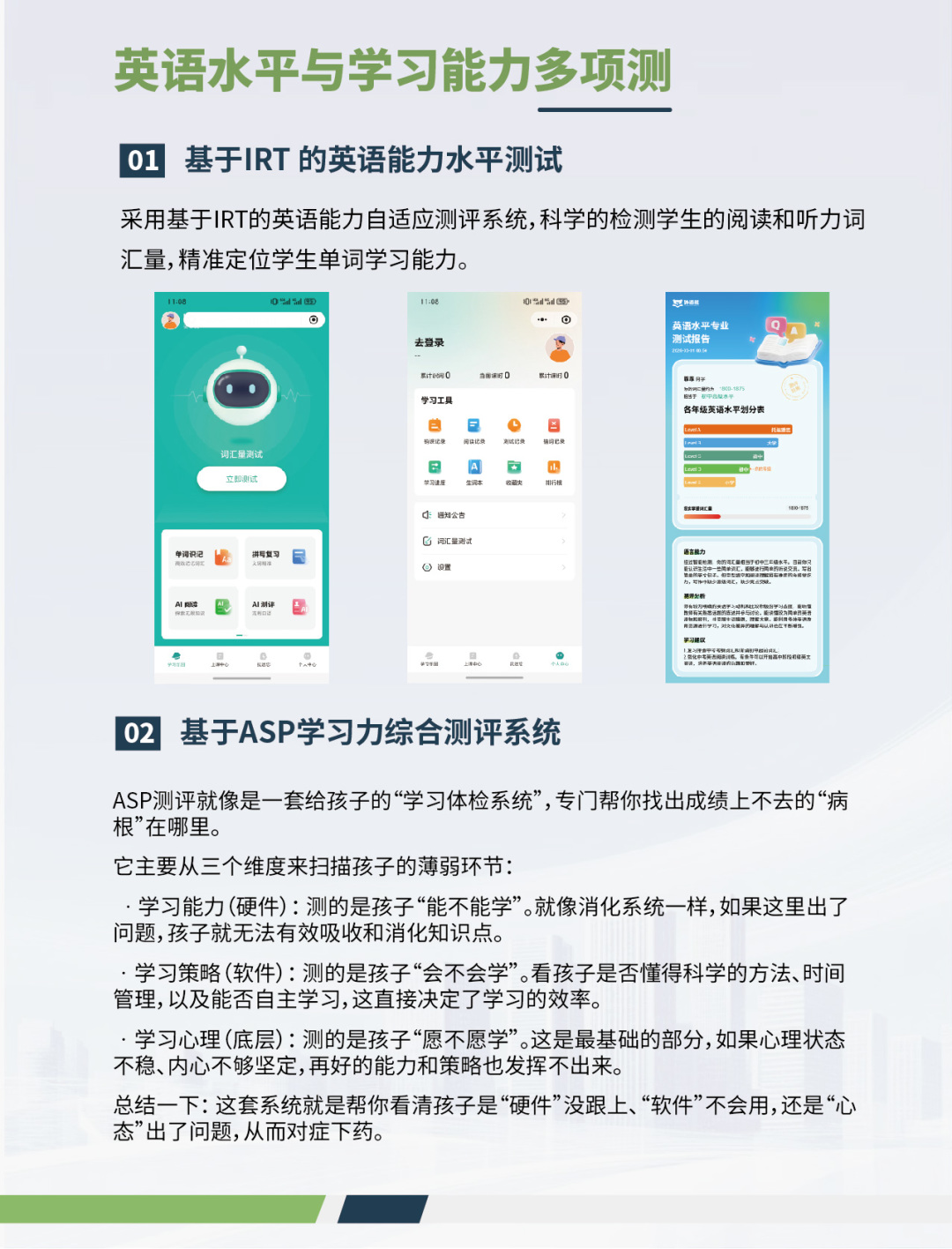 在孩子的英语学习路上,你是否也深陷这样的困境:单词背了忘、忘了背,陷入周而复始的无效循环;补课班报了一堆,钱花了、时间耗了,成绩却始终原地踏步;孩子一提英语就抵触厌学,上课听不懂、做题全靠蒙,越学越没自信;中高考临近,英语偏科成了升学路上最大的绊脚石…… 这些困扰无数家庭的英语学习难题,如今有了更科学、更高效的解决方案。深耕教育服务领域多年的英语智能提分辅导品牌 —— 考试大师外语熊,以 「AI 私教 + 真人教练」 双师模式为核心抓手,融合人工智能技术与脑科学前沿成果,打造「测→定→学→练→伴」五步全链路提分闭环,既用科技实现千人千面的个性化精准教学,又用真人陪伴赋予教育温度,用科技赋能教育,用方法破解难题,让每个孩子都能高效学好英语,轻松应对考试。 考试大师外语熊,始终以「让每个孩子都能高效学好英语,轻松应对中高考」为使命,以「用科技赋能教育,让英语学习不再困难,让每个家庭更幸福」为愿景,专注于通过 AI 技术与科学记忆算法,从根源上解决孩子英语词汇、语法、阅读、听力、口语全维度学习难题。 品牌以「AI 私教 + 真人教练」双师模式为核心,打造个性化、高效率的学习体验,始终坚守「学生第一、科技赋能教育、定制化学习路径、结果可视化」的核心价值观,秉持「教育有道、育人有心、提分有法、教子有方、成长有迹、未来有望」的教育理念,多年来凭借扎实的教学效果与完善的服务体系,赢得了万千家庭的认可,致力成为中国家庭信赖的英语提分品牌。 不同于市面上单一的单词速记产品、碎片化的课程教学,考试大师外语熊以「测→定→学→练→伴」五步闭环为核心,打造了从入学测评到考前冲刺的一站式英语提分全体系,形成了可落地、可追溯、可保障的完整提分逻辑。 拒绝盲目学习、一刀切教学,考试大师外语熊以两大权威测评体系为核心,30 分钟即可全面摸清孩子的真实英语水平与学习瓶颈,为个性化学习找准根源、锚定方向。 其中,IRT 自适应英语能力测评,基于项目反应理论打造,能科学检测学生的阅读和听力词汇量,精准定位当前英语能力层级,误差控制在十位级,为孩子锁定最适配的学习起点; ASP 学习力综合测评,则从学习能力、学习策略、学习心理三个维度,全面扫描学生的薄弱环节,精准找出成绩上不去的「病根」,真正实现对症下药、靶向提升。 基于科学测评结果,考试大师外语熊为每个孩子定制专属的学习与提分全案,彻底告别同质化的一刀切教学,让孩子的每一分钟学习都精准有效,不做无用功。 针对不同孩子的年级、词汇量、薄弱项与学习目标,品牌会定制阶梯式的专属学习路径,无论是基础补漏、学期同步,还是中高考冲刺、能力拔高,都能精准适配; 依托独创的双标签抗遗忘模型,结合孩子的专属记忆曲线,自动生成个性化黄金复习计划,优先复习遗忘最快、考试分值最高的单词,让复习量减少 20%,记忆效果提升 12.5%; 同时搭建「词汇破障→语法巩固→题型突破→能力锻造」四阶提分推进体系,清晰规划从基础到高分的进阶路径,让提分有方向、有方法、有保障。 以八大核心黑科技为支撑,考试大师外语熊打造了六维一体全能力课程体系,同时遵循「会认、会读、会听、会写、会用」五项全能教学标准,从根源上夯实孩子的英语基础,实现综合能力全面提升。 在课程设置上,品牌打造了覆盖英语学习全场景的六大核心模块: 智能单词课程以独创抗遗忘引擎,破解单词记不住的核心难题,覆盖小初高全阶段教材同步词库与中高考高频词库; 智能句型课程通过 200 + 核心句型专项训练,培养孩子语感,为阅读写作筑牢基础; 智能语法课程以闯关式学练测闭环,帮助孩子系统化攻克语法难关; 智能阅读课程基于孩子词汇量精准分级,AI 智能推荐时文与真题文章,词文结合提升阅读理解与解题能力; 智能听力课程结合抗遗忘引擎设计阶梯式训练,精准贴合中高考听力要求; 智能口语课程通过 AI 实时语音评测,逐词纠正发音,帮助孩子练就地道口语。 八大核心黑科技全程为学习保驾护航,从海马 LTP 技术、双标签抗遗忘模型,到多感官记忆技术、抗疲劳兴奋诱导技术,再到 AI 分级阅读系统、24 小时 AI 辅学交互系统,全方位破解记忆难题,提升学习效率;同时以「认、读、听、写、用」五步闭环标准化教学流程,确保每个单词都能被孩子真正掌握、灵活运用,让英语能力实现全方位进阶。 拒绝盲目题海战术,考试大师外语熊打造七步模块晋升学习法,形成完整训练闭环,让练习精准靶向孩子的薄弱项,真正实现学以致用、稳步提分。 品牌严格遵循「识记→复习→阅读复训→专项训练→模拟测试→错题攻坚→提分冲刺」的七步训练路径,融合心流理论、限时记忆、间隔重复等科学学习原理,让孩子实现沉浸式学习、系统性训练。 设计词义闯关、听写默写、听力阅读专项等多梯度题型,由浅入深引导孩子在黄金记忆节点主动回想,强化记忆效果 系统自动归集孩子的错题盲区,针对易错点、易混点、高频失分点推送专项强化训练,把每一个失分点都变成得分点 同时融入积分、金币、PK、闯关等趣味设计,把枯燥的刷题变成趣味挑战,让孩子从被动练习变为主动挑战,彻底扭转厌学情绪,唤醒学习内驱力。 好的教学效果,离不开专业的陪伴与监督。 考试大师外语熊打造「AI 私教 + 真人教练