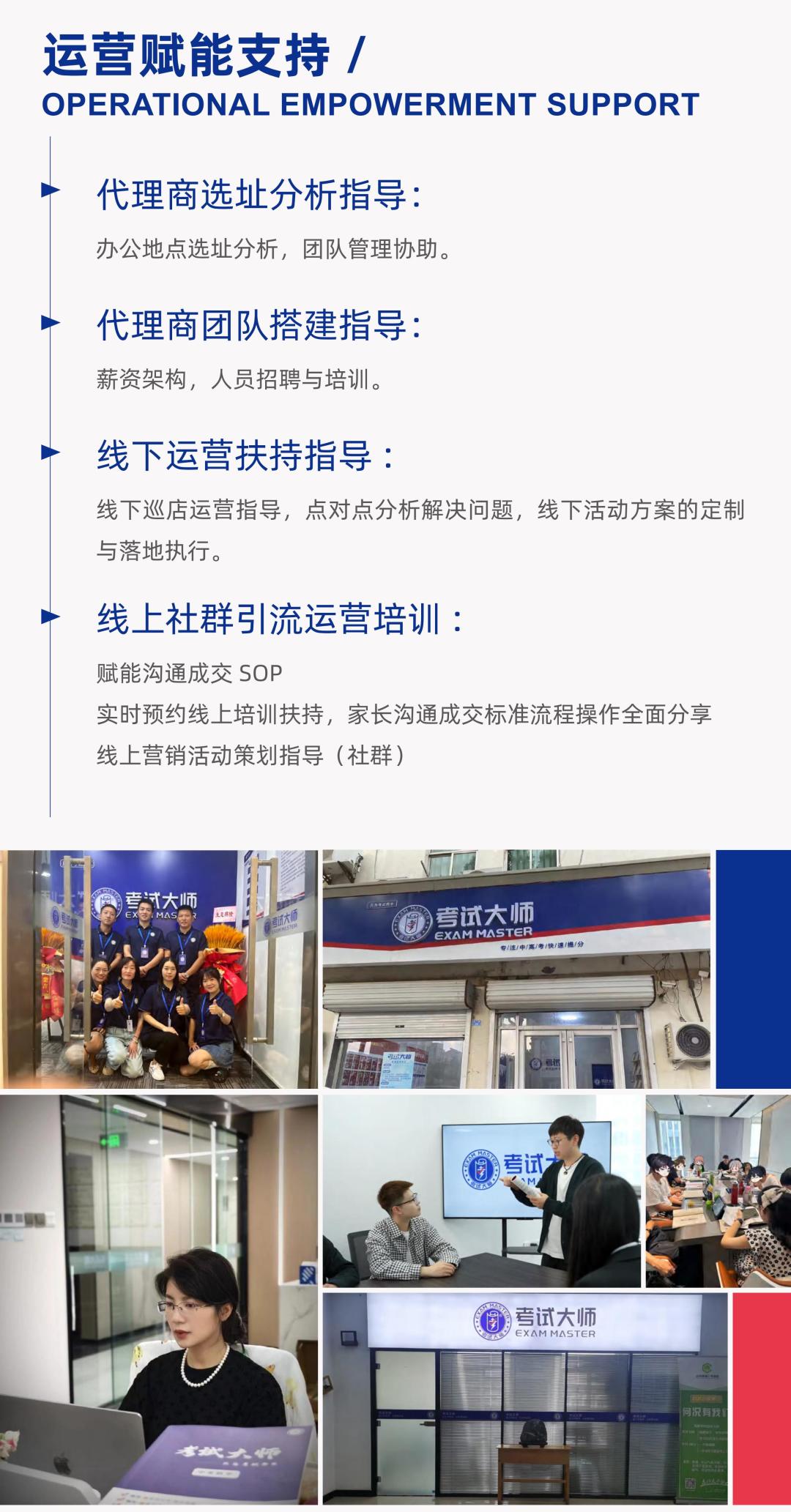 考试大师为加盟商提供全方位支持体系。在市场推广方面,构建了完善的品牌推广网络,涵盖百度、抖音、快手等多平台全媒体推广,并联合代理商打造全网矩阵营销体系。同时,为加盟商提供新媒体全网营销培训,如定制抖音矩阵系统运营方案并开展一对一帮扶,助力加盟商迅速打开市场,吸引更多生源。在运营管理上,总部提供从选址装修、人员招聘到教学管理、客户服务等一系列标准化运营指导手册,确保加盟商业务顺利开展。此外,定期组织加盟商培训交流活动,分享前沿教育理念、教学方法和市场运营经验,促进共同成长。