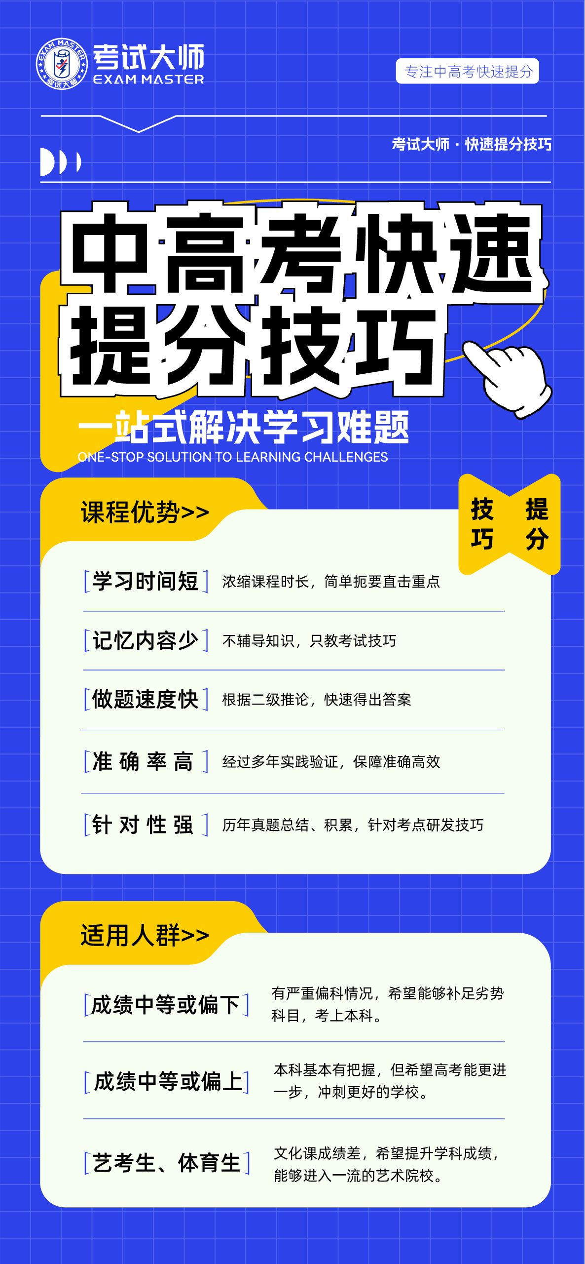 考试大师一直以来秉持 “教育 + 科技” 融合驱动的理念,全力构建教育全产业链服务生态。其 “考试大师” 品牌凝聚专业教研团队数十载心血,经众多一线教师与学霸考生实战检验,铸就一套以独特考试方法和答题技巧为核心的应试课程体系。考试大师凭借卓越品质赢得学子与家长的广泛认可,在中高考备考领域脱颖而出,成为众多学子逐梦路上的有力伙伴。