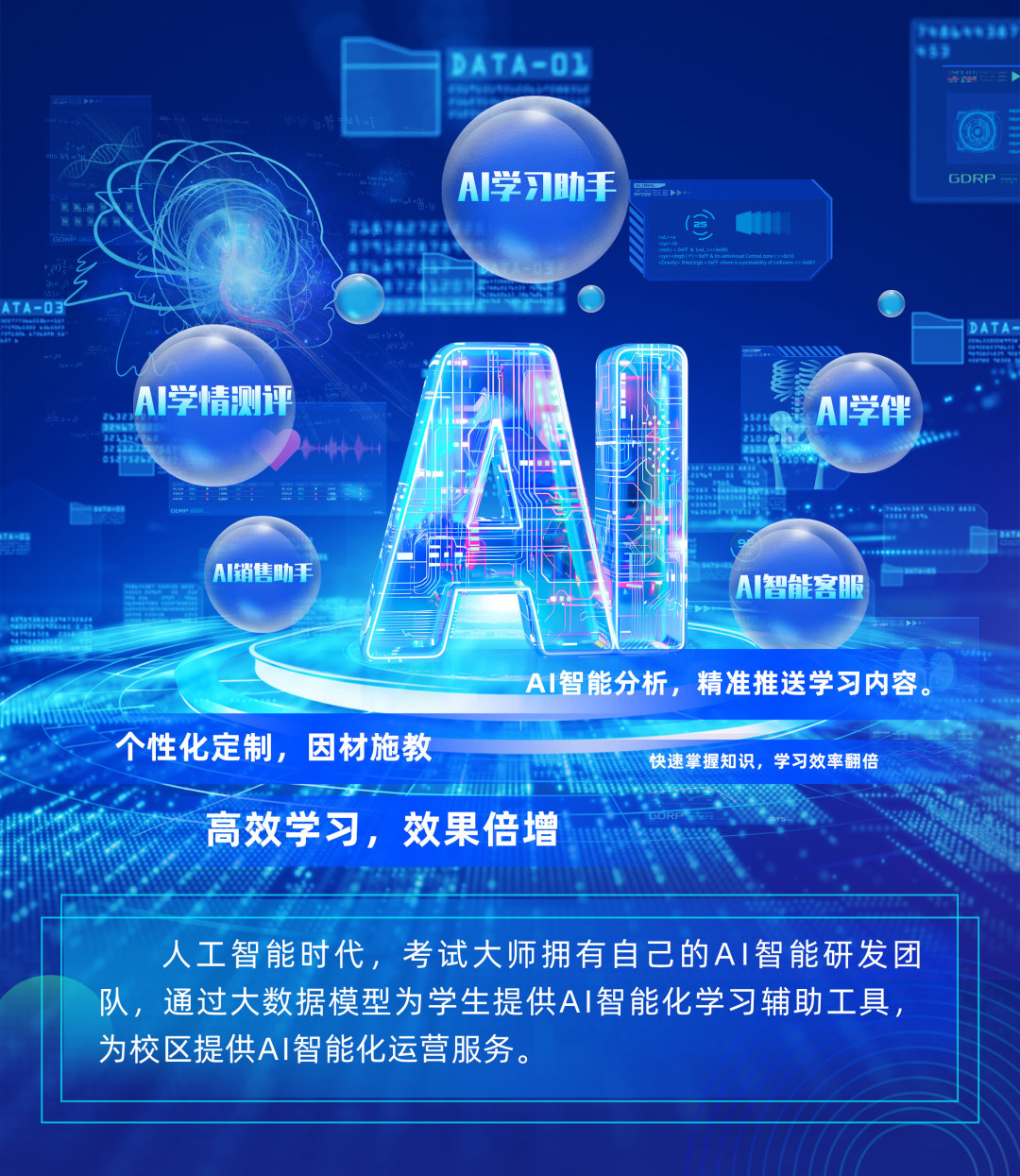 考试大师始终站在教育科技的前沿,以 AI 智能算法为核心驱动力,深度挖掘学生的学习数据。通过对学习时长、答题准确率、知识点掌握情况等多维度数据的精准剖析,为每一位学员绘制独一无二的学习蓝图。