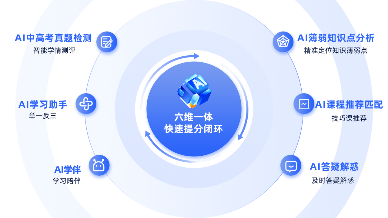 各个环节紧密协作,形成从检测、分析、课程推荐、答疑、陪伴直至能力提升的提分闭环,助力学生提高成绩。