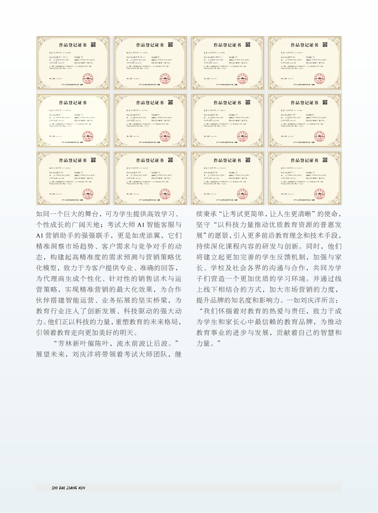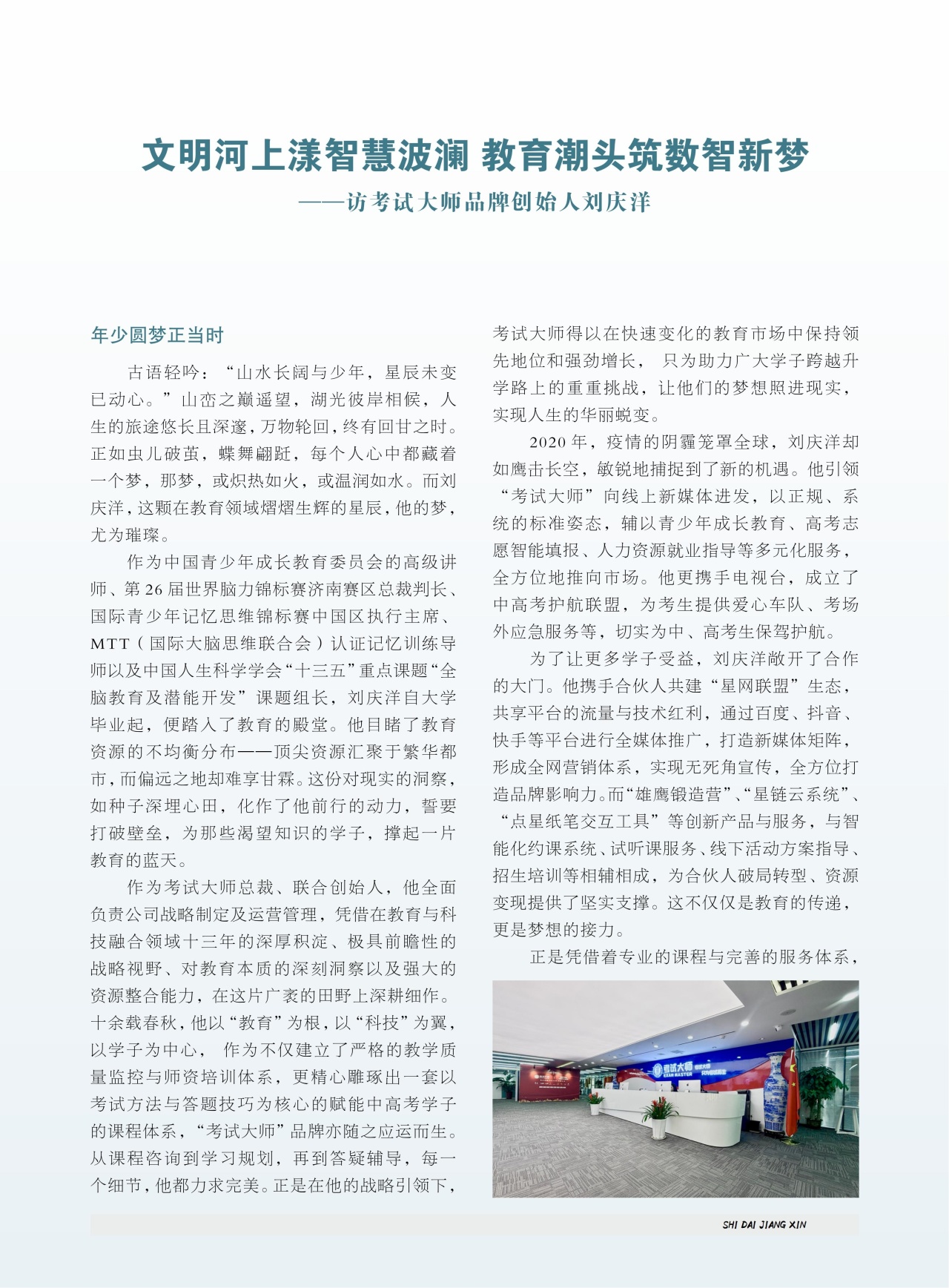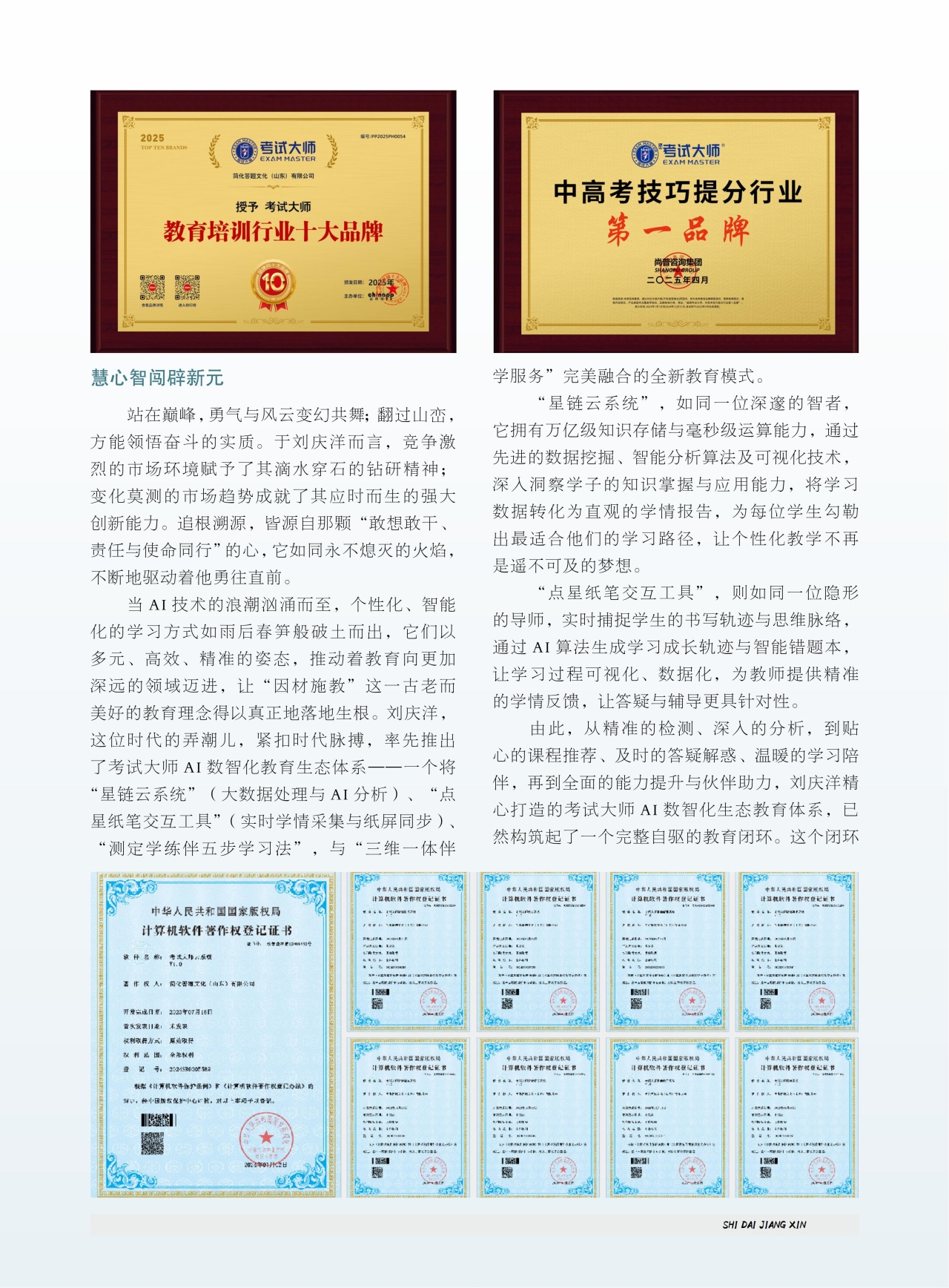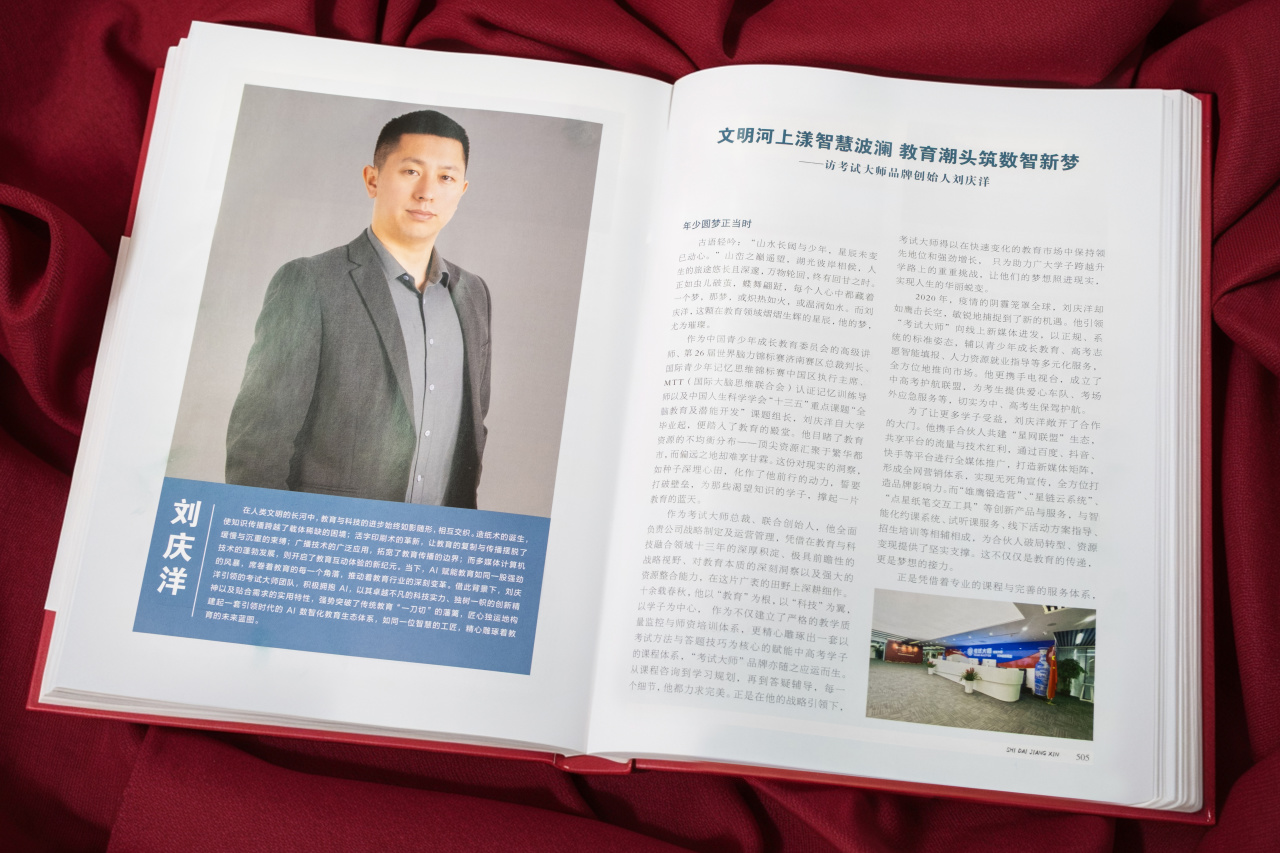《时代匠心》文献通过深度访谈与案例剖析,将刘庆洋的教育实践与成果系统性地提升为新时代教育革新的典范,进一步强化了考试大师的品牌公信力与行业影响力。