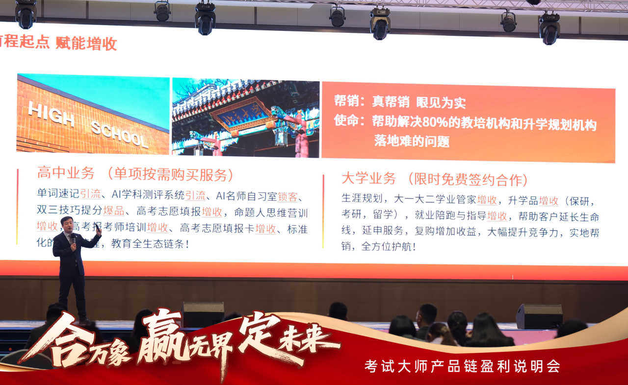 与此同时,教培行业仍深陷发展困局:单品类运营内卷加剧、获客成本持续高企、用户生命周期短、盈利模式单一、抗风险能力弱,成为制约从业者发展的核心痛点。正是基于对行业趋势的精准研判与市场痛点的深刻洞察,考试大师以十余年中高考教育领域的教研沉淀为根基,完成了本次全生态产品链的战略升级,为行业打造了一套高盈利、抗风险、长周期的可持续发展解决方案。