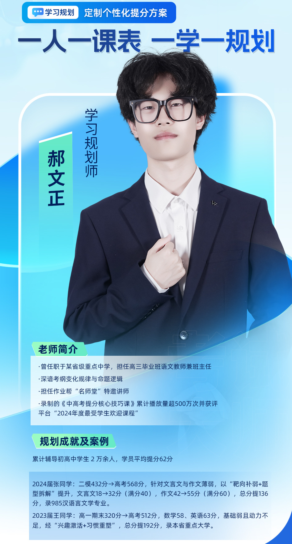 凭借多年一线教学与教研经验,文正老师建立起一套系统化的规划方法论。他能够精准把握学科知识体系(如高中数学300+节课程难度梯度与关联结构),并通过深度电沟通,全面了解学生的学习水平与性格特点。