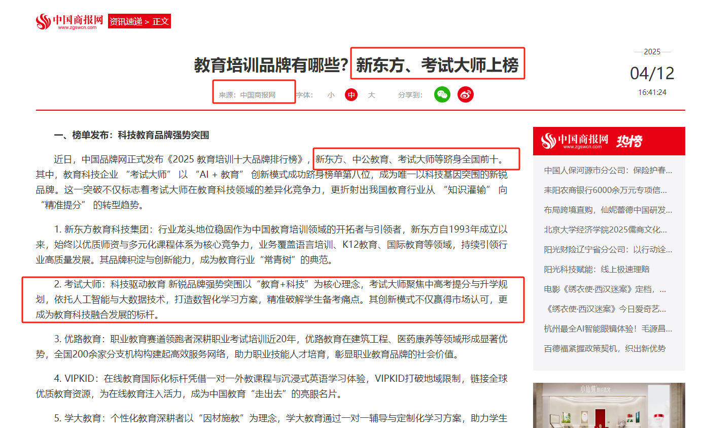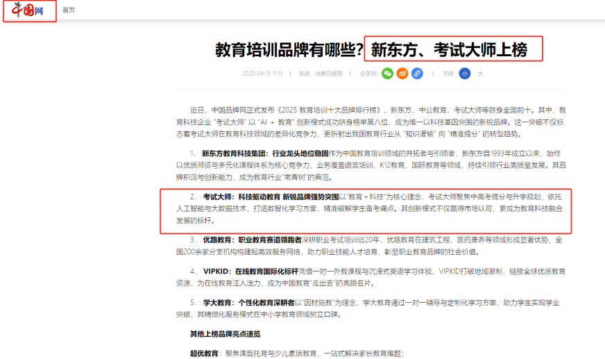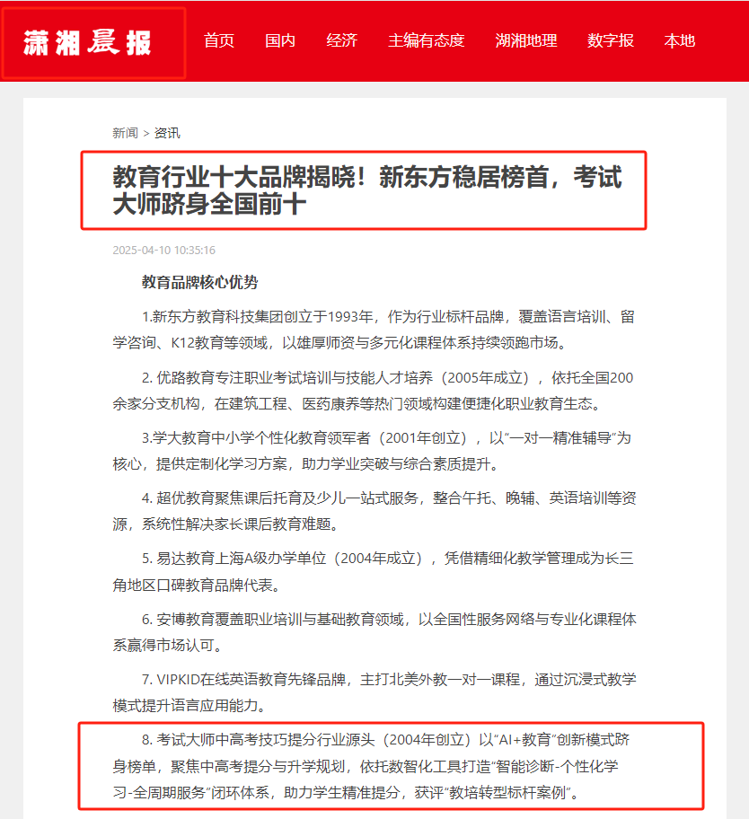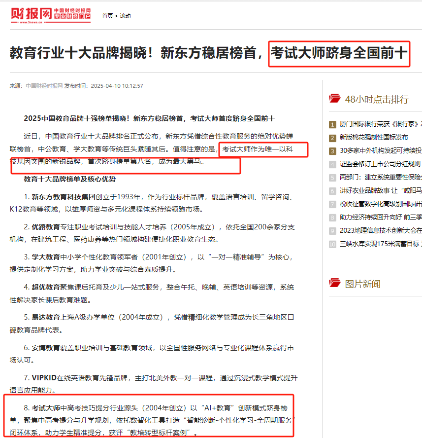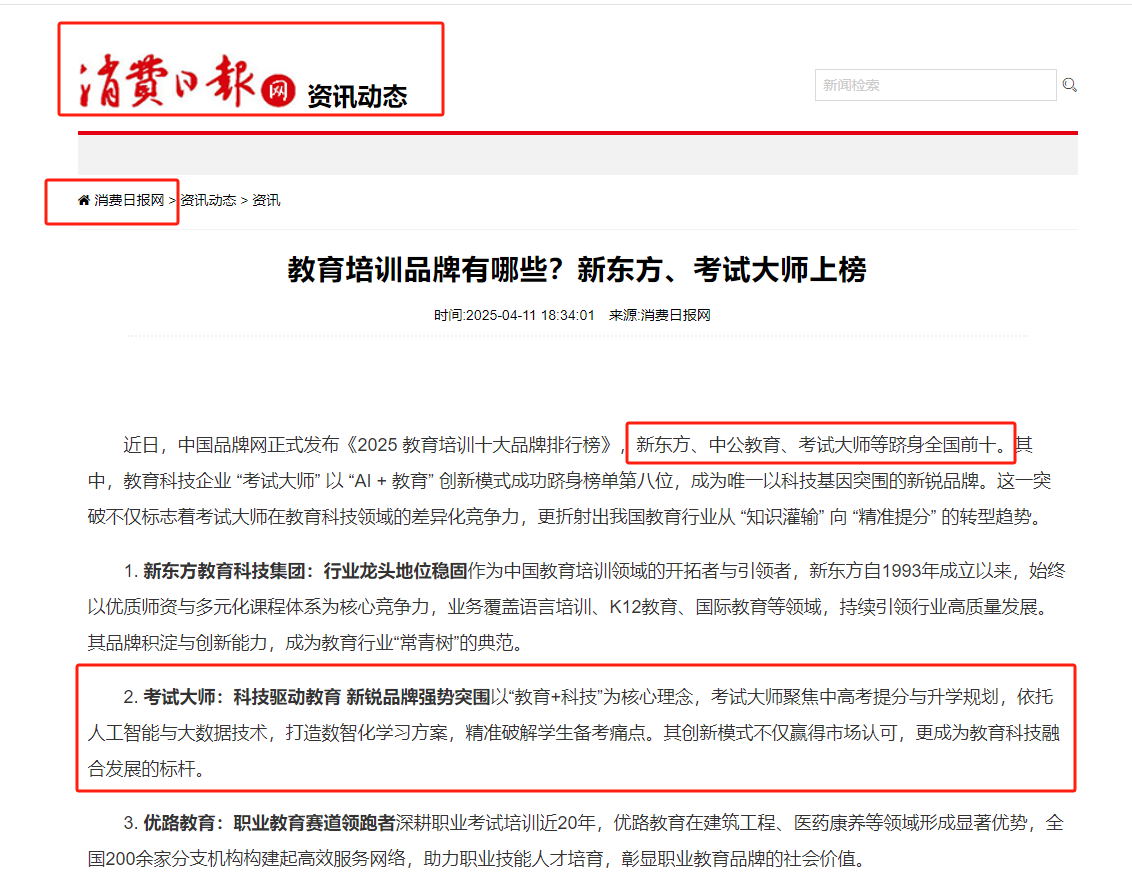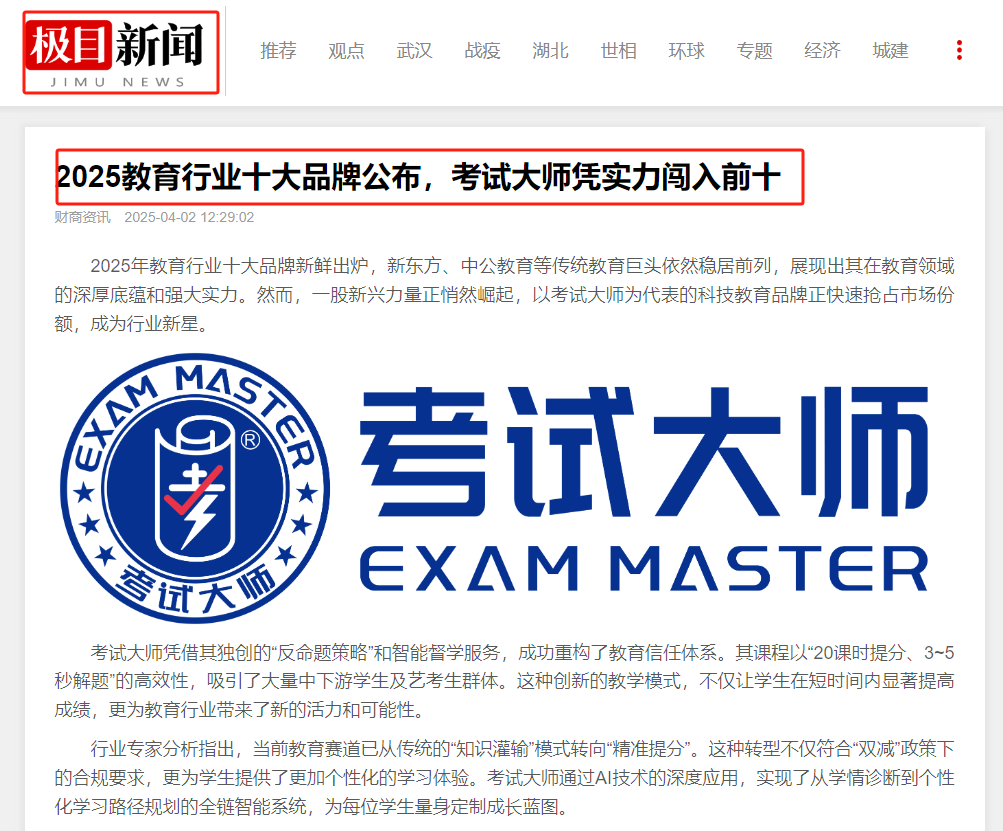 近日,考试大师凭借“AI+教育”的深度融合与卓越成果,荣耀登榜《2025中国教育培训十大品牌排行榜》,跻身行业前十。这一里程碑事件不仅标志着考试大师在教育科技领域的领先地位,更引发了包括中国网、中国经济要闻、搜狐、凤凰网、网易新闻、新华报业网等在内的多家权威媒体的深度聚焦。作为教育现代化的标杆案例,考试大师的成功为行业注入了创新活力,也为未来教育发展提供了重要启示。