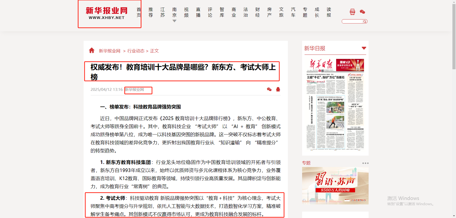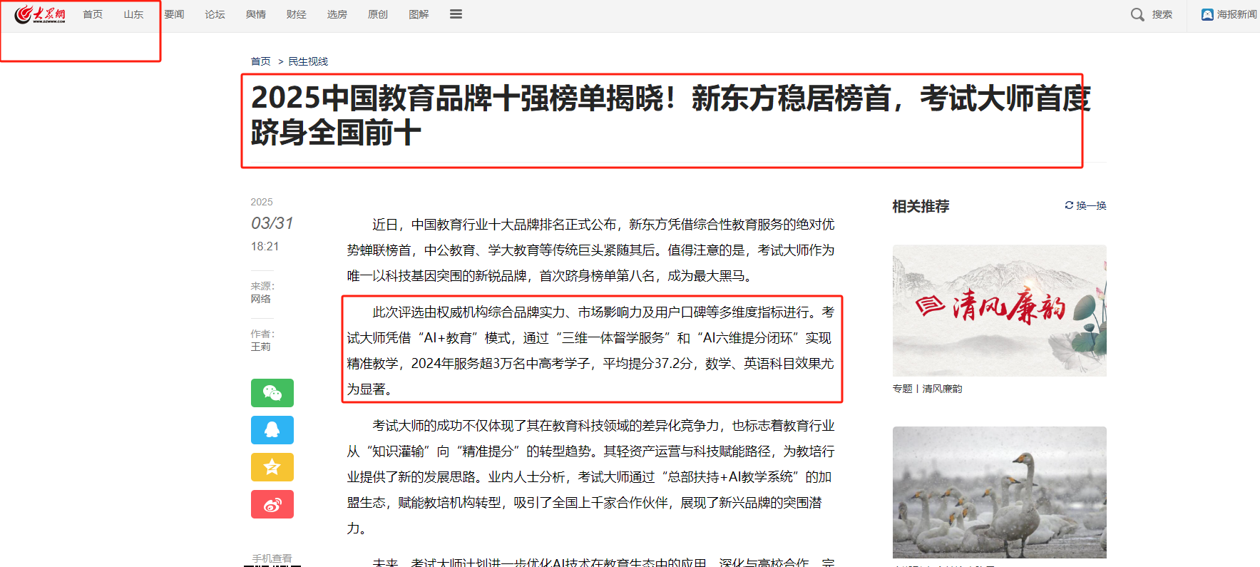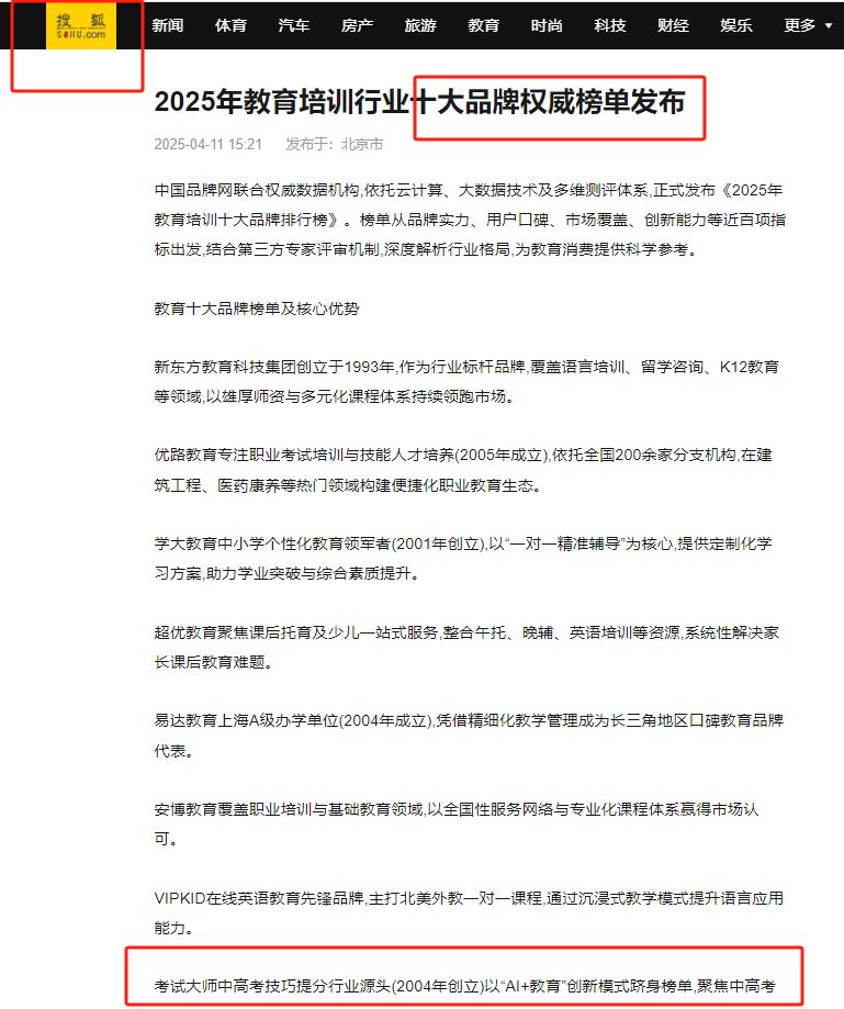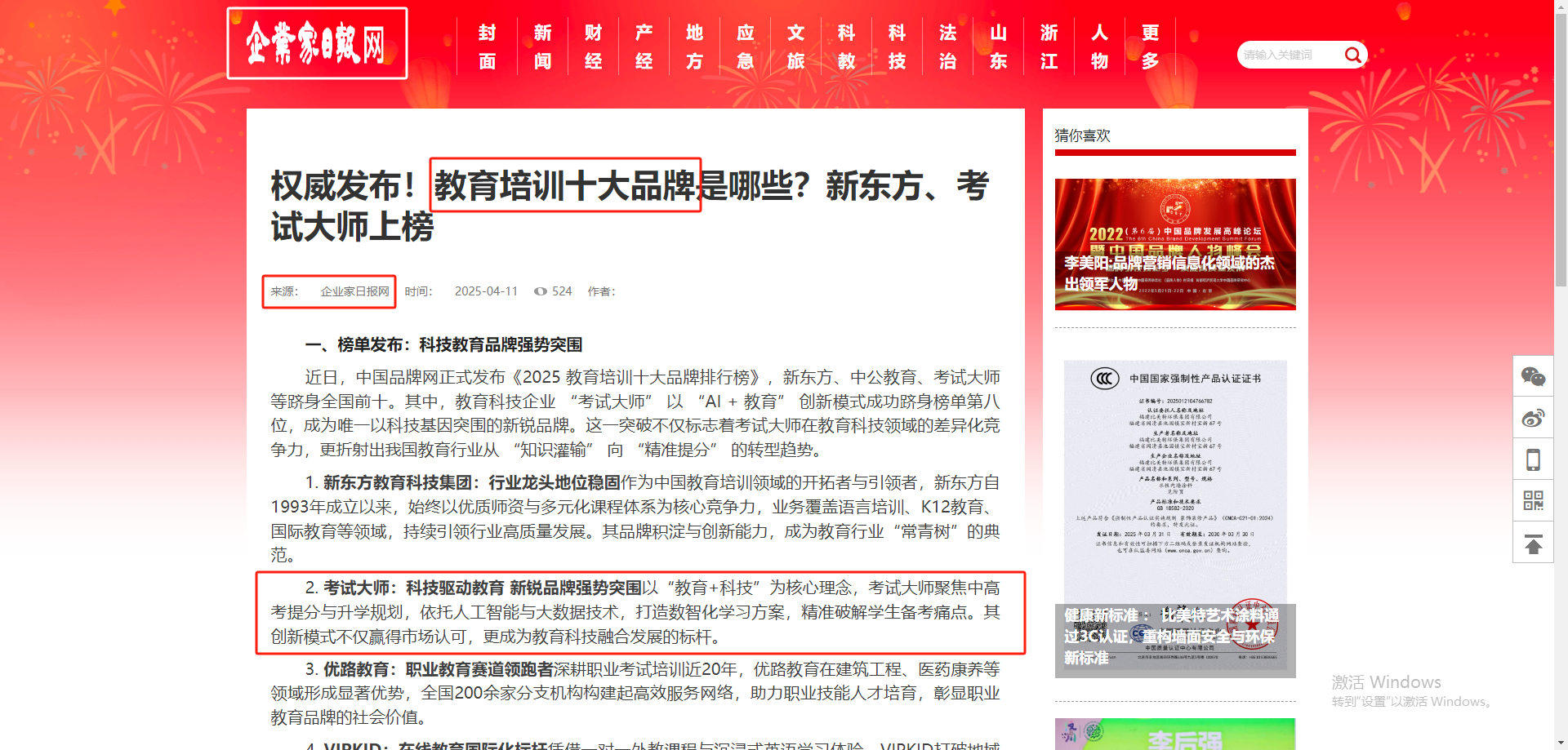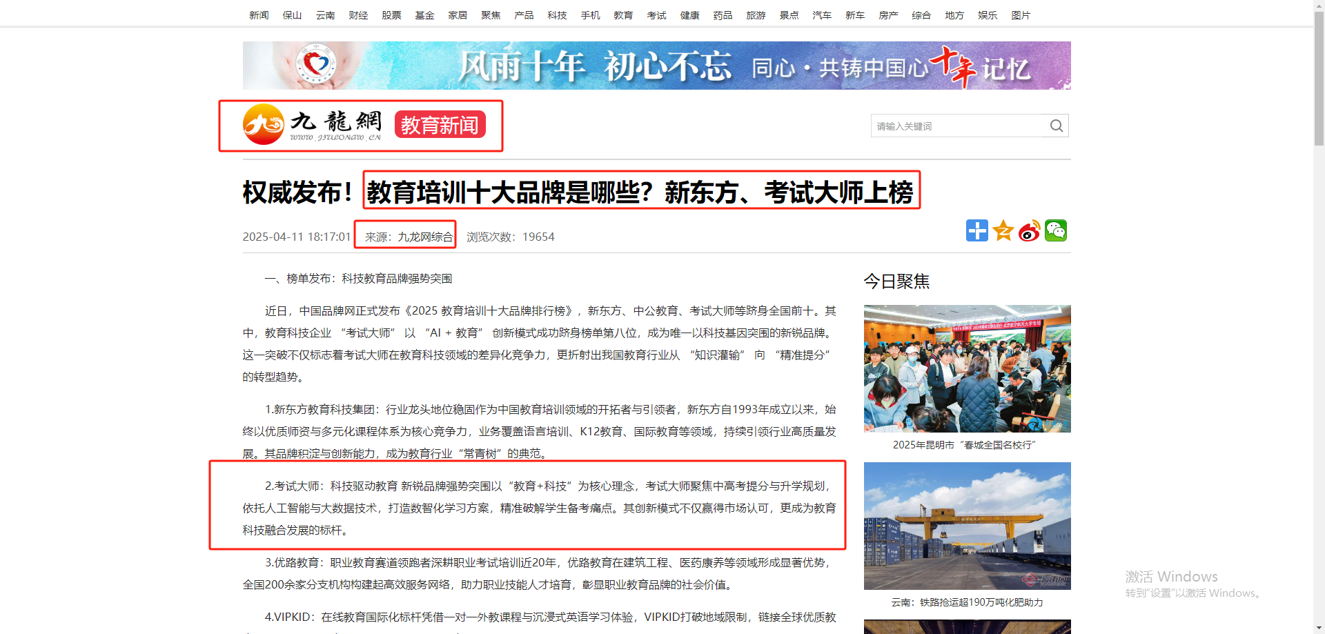 近日,考试大师凭借“AI+教育”的深度融合与卓越成果,荣耀登榜《2025中国教育培训十大品牌排行榜》,跻身行业前十。这一里程碑事件不仅标志着考试大师在教育科技领域的领先地位,更引发了包括中国网、中国经济要闻、搜狐、凤凰网、网易新闻、新华报业网等在内的多家权威媒体的深度聚焦。作为教育现代化的标杆案例,考试大师的成功为行业注入了创新活力,也为未来教育发展提供了重要启示。