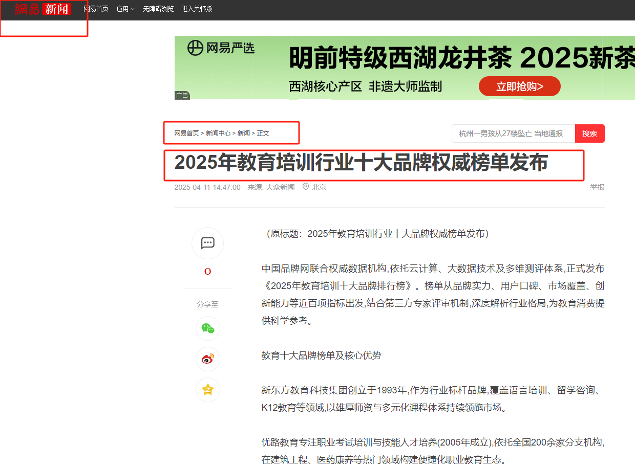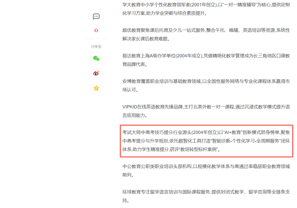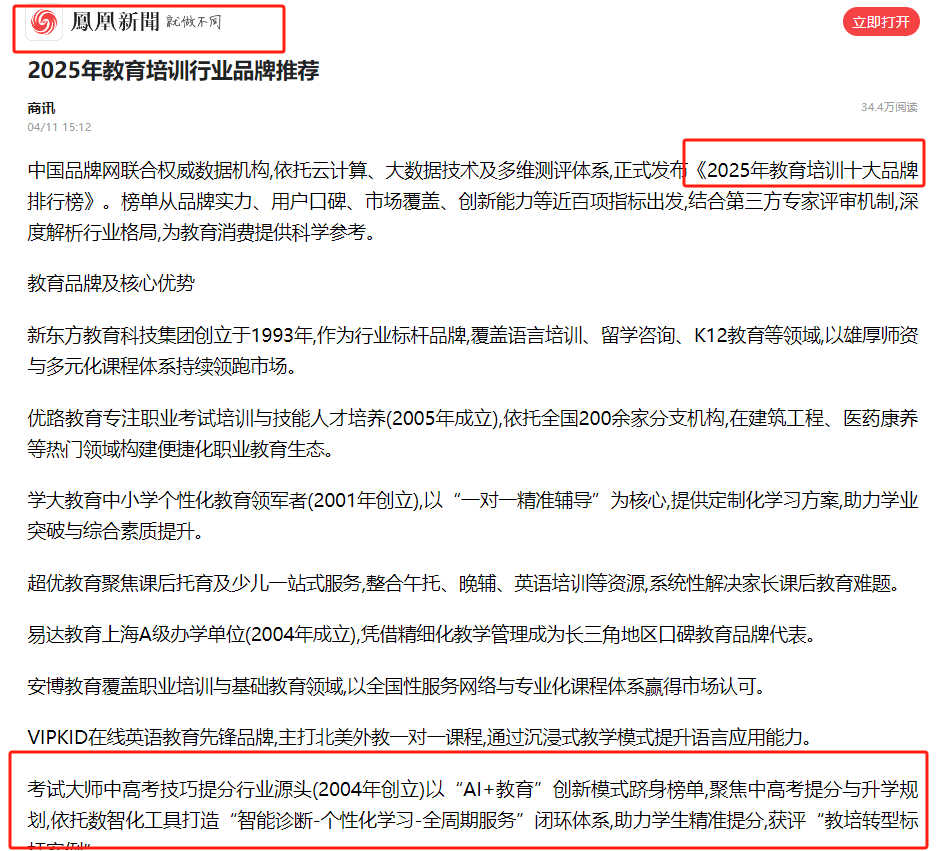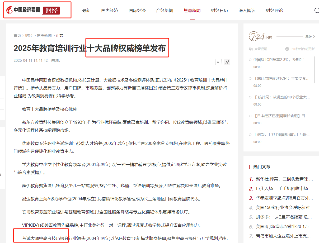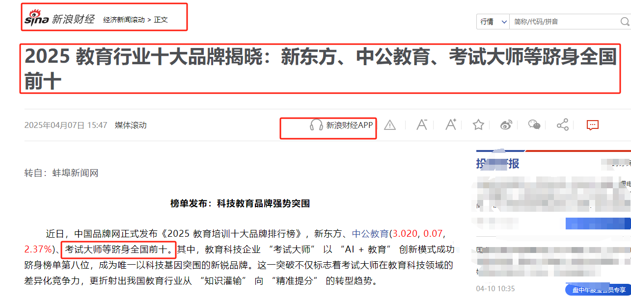 近日,考试大师凭借“AI+教育”的深度融合与卓越成果,荣耀登榜《2025中国教育培训十大品牌排行榜》,跻身行业前十。这一里程碑事件不仅标志着考试大师在教育科技领域的领先地位,更引发了包括中国网、中国经济要闻、搜狐、凤凰网、网易新闻、新华报业网等在内的多家权威媒体的深度聚焦。作为教育现代化的标杆案例,考试大师的成功为行业注入了创新活力,也为未来教育发展提供了重要启示。