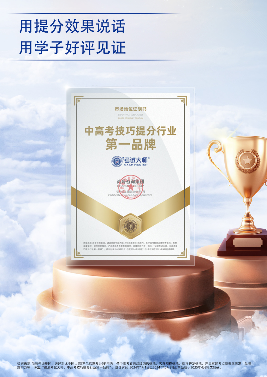 数据来源:尚普咨询集团,通过对比中国大陆(不包括港澳台)范围内,各中高考教培品牌销售情况、客群规模情况、课程开发情况、产品真题考点覆盖率情况、品牌影响力等,得出:“诚道考试大师,中高考技巧提分行业第一品牌”。统计时间:2024年1月1日至2024年12月31日;本证明于2025年4月完成调研。